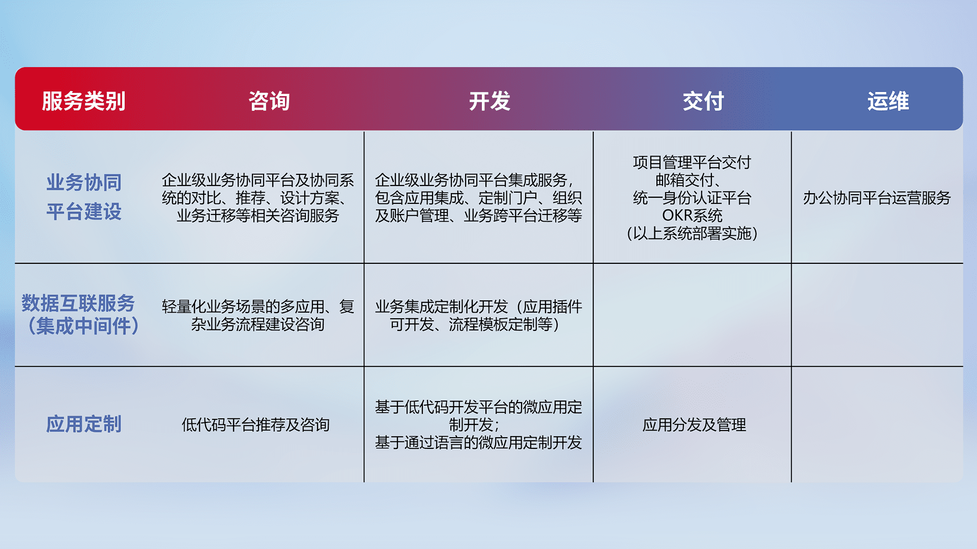 针对钉钉、、、企微、、IDaas等平台级产品提供产品的规划、、、方案、、、、交付、、、、定制化开发等服务,,,实现如统一协同办公、、、、智能客户服务、、混合会议管理、、、智能数据查询、、、、等业务场景,,,实现数字化转型。。