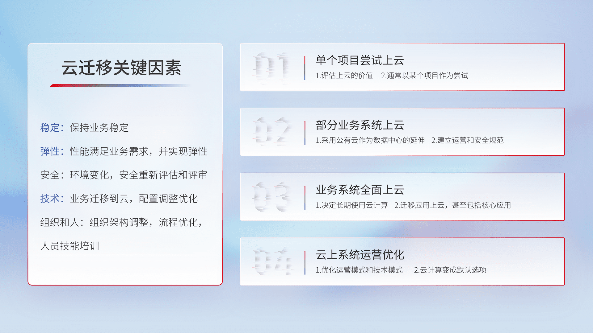 结合实际业务,,,,从规划设计、、云平台选型、、、、云原生改造、、、、数据迁移、、集成交付,,,,迁移全过程为客户识别最佳上云路径,,,做好风险识别管理,,,,设计网络架构、、身份权限、、、、安全审计合规、、操作审计、、日志审计、、、监控告警策略、、多站点容灾设计等,,,,对云上基础设施进行整体规划,,,提升IT治理水平,,,,以满足弹性、、高可用、、、、高性能的需求。。。。