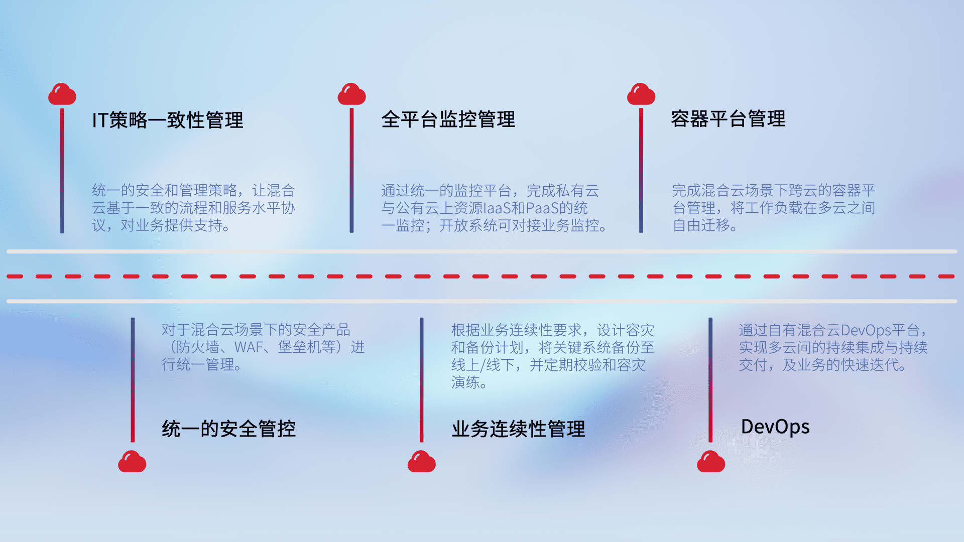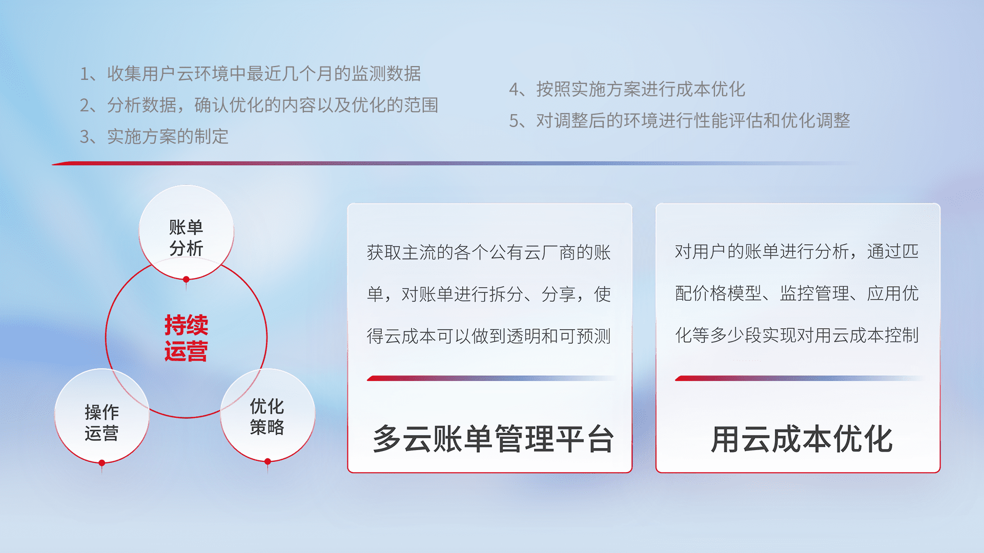 通过多云纳管,,,以统一的资源数据模型把客户的云资源进行抽象和封装,,,,进而实现对多云资源的统一操作,,,保障云资源管理的可靠性、、稳定性与可用性。。。量身定制化运维内容,,,配置、、、、开发运维、、、补丁管理、、、、备份、、监控、、、、认证和访问管理、、审计和日常巡检等,,,,保障在用云过程中的可靠度,,稳定度以及高可用率。。。。